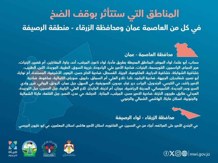 تعليق ضخ مياه الديسي عن مناطق في عمان والزرقاء لمدة 96 ساعة بدءاً من الأحد